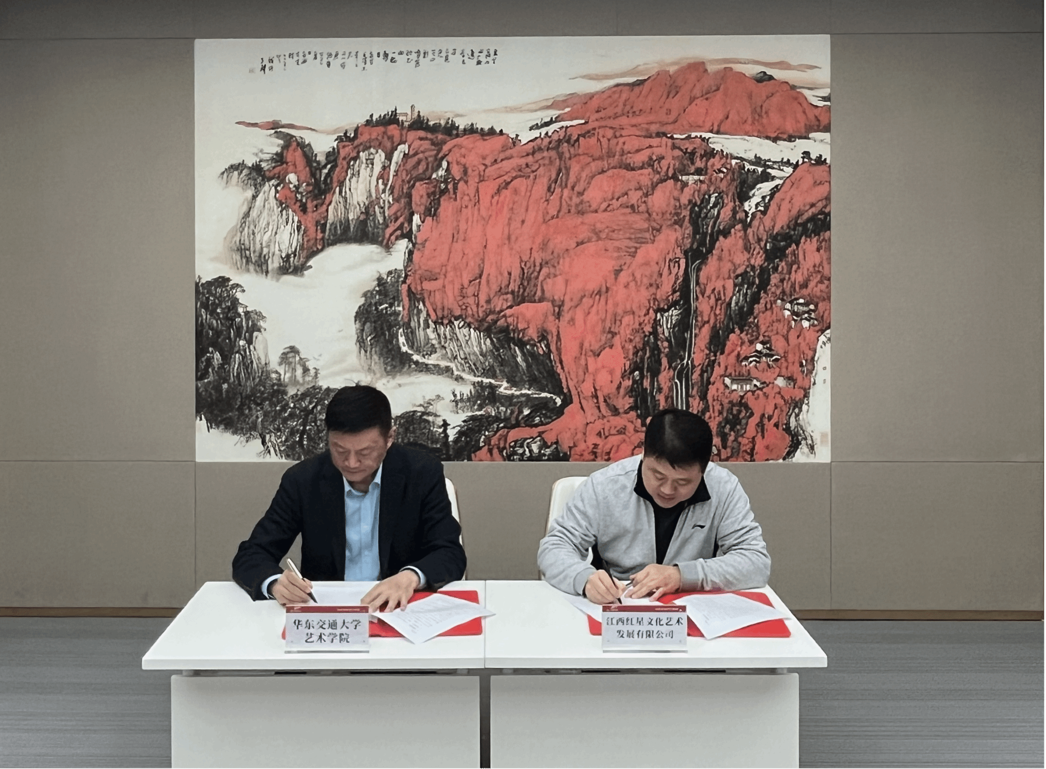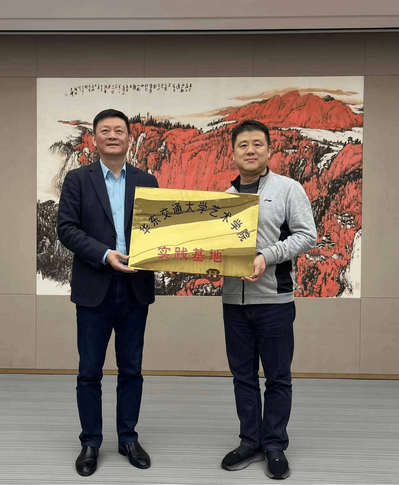 座谈会后,双方举行了校企合作实习基地的签约仪式和“华东交通大学艺术学院实践基地”的授牌仪式。双方领导共同揭牌,全体参与人员合影留念。