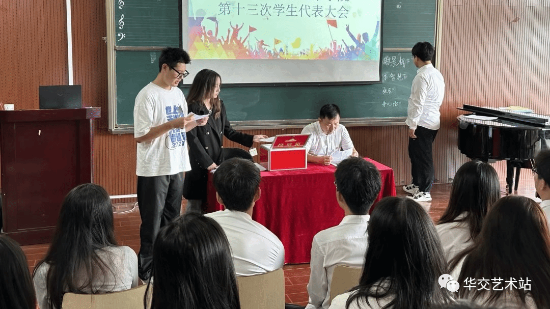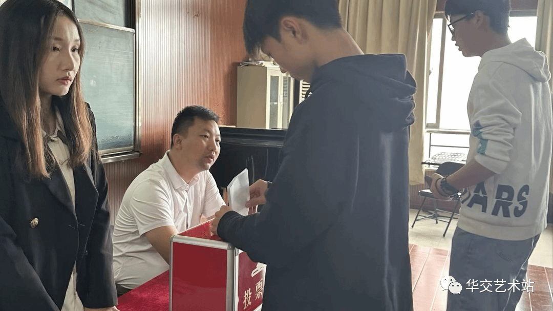 艺术学院学生会主席团的四位候选人依次进行竞选,由在场的老师和同学们依次在投票箱内为竞选者们投出宝贵的一票。